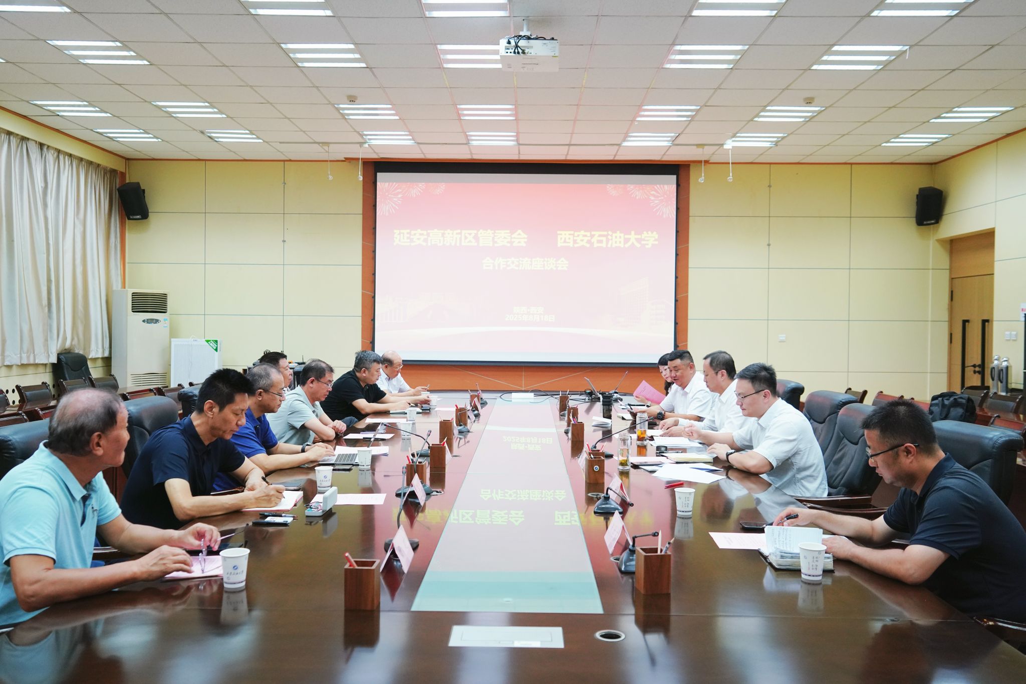 8月18日上午,延安高新技术产业开发区党工委副书记、管委会主任尚文隆率队来校就深化产学研协同、共建高水平创新平台等相关事宜交流座谈。延安高新区党工委委员,延安能源装备集团(简称“集团”)党委书记、董事长丁许军,集团总经理、延安嘉盛公司董事长苏忠贵,集团副总经理、延安石源公司董事长刘建忠,集团副总经理、延安嘉盛公司总经理苏小东陪同来访。我校副校长张荣军出席座谈会并讲话。